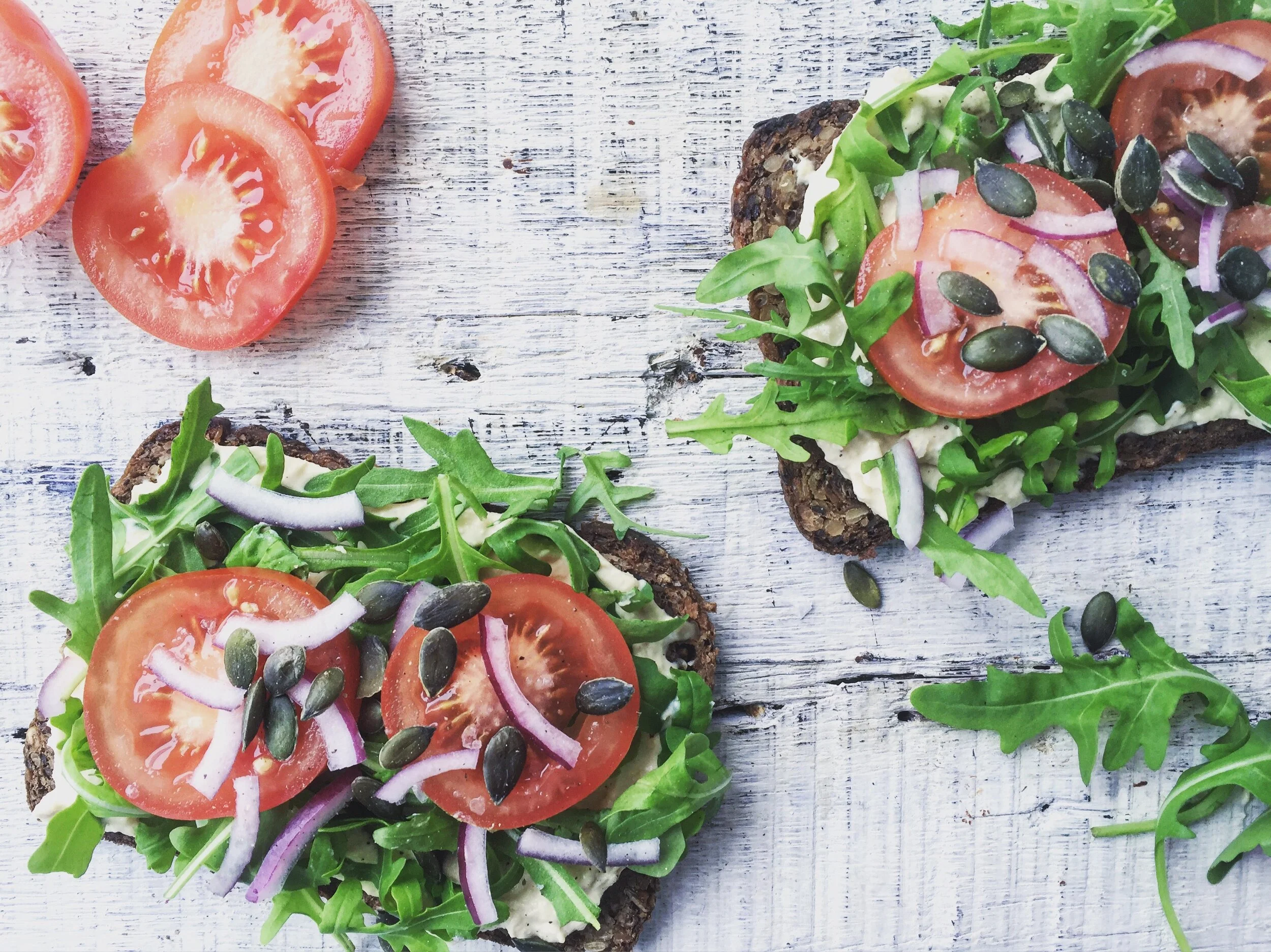 After toasting the bread, spread 2 tablespoons of hummus on each piece of toast. Top each slice with rocket, red onion, cucumber, tomato and capers. Sprinkle with sea salt. Yum!