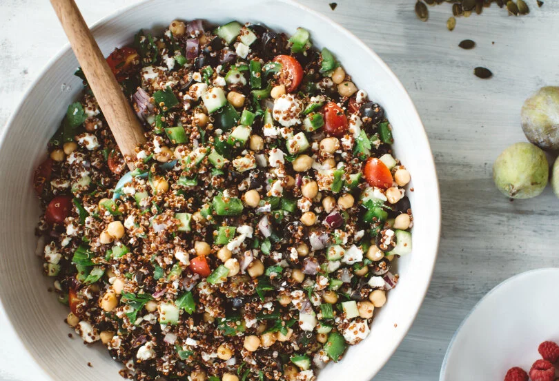 Cook quinoa. Add quinoa, water and 1/4 teaspoon salt to a pan. Bring to a boil. Once boiling, cover and reduce to simmer until all liquid is absorbed, about 12 minutes. Spread your cooked quinoa on a baking tray to cool faster. If you add your veggies to hot quinoa they will go soft and mushy. Wait for quinoa to cool or make it in advance.